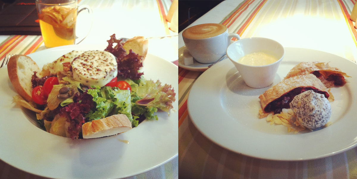 Dirigi-me ao Menza, por sugestão da mana. E aqui, meus amigos, descobri a maravilhosa salada de queijo caramelizado, que acompanhei com um chá quente de maçã e canela e rematei com strudel de cereja e gelado de sementes de papoila, para surpresa do funcionário. Porque é que as minhas experiências gastronómicas causam tanta risota e surpresa? Acho que nunca saberei!