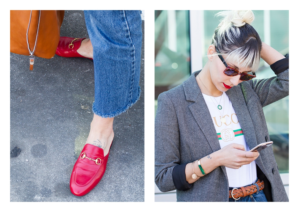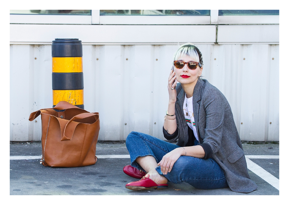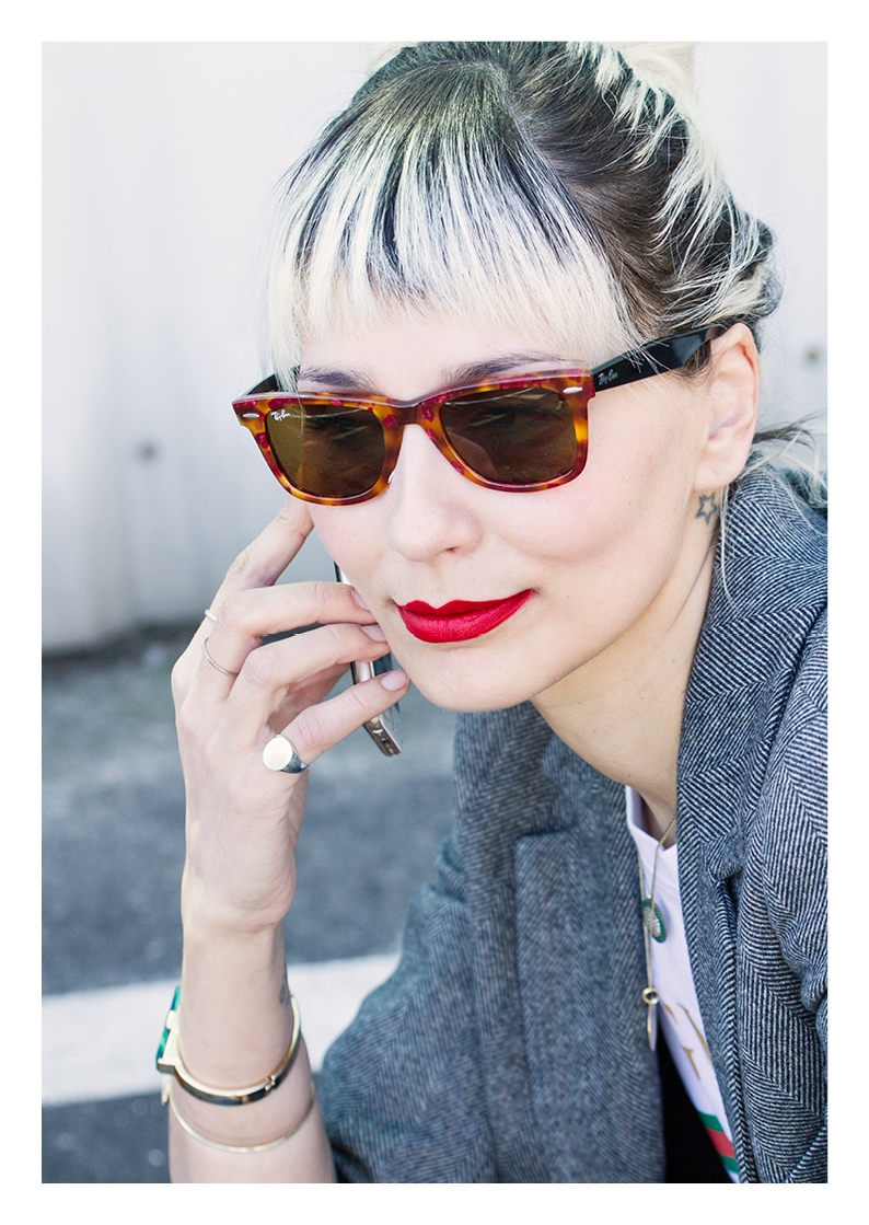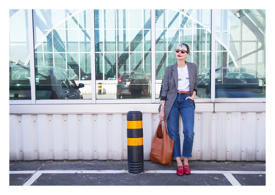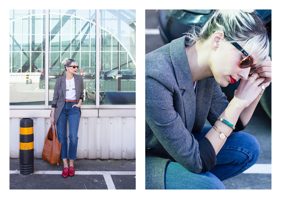 . Sunnies Ray Ban (Wayfarer) . Lipstick Sephora (Cream Lip Stain, Flame Red) . Blazer Zara . Necklaces somewhere in Cúria & Le Love . T-shirt Shoelaces . Rings Lia Gonçalves & N.Y. Jewellery . Bracelets&Bag Parfois . Belt Lefties . Jeans Vintage (Absolutribut) . Shoes Gucci .