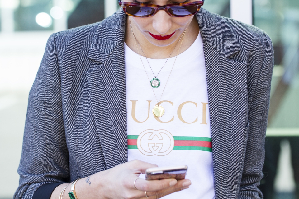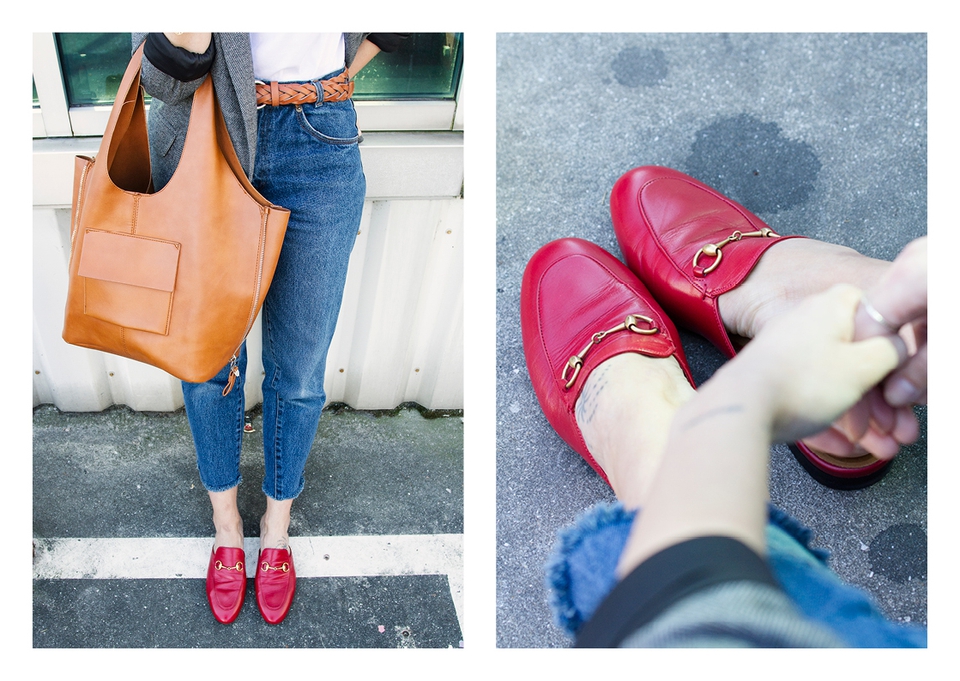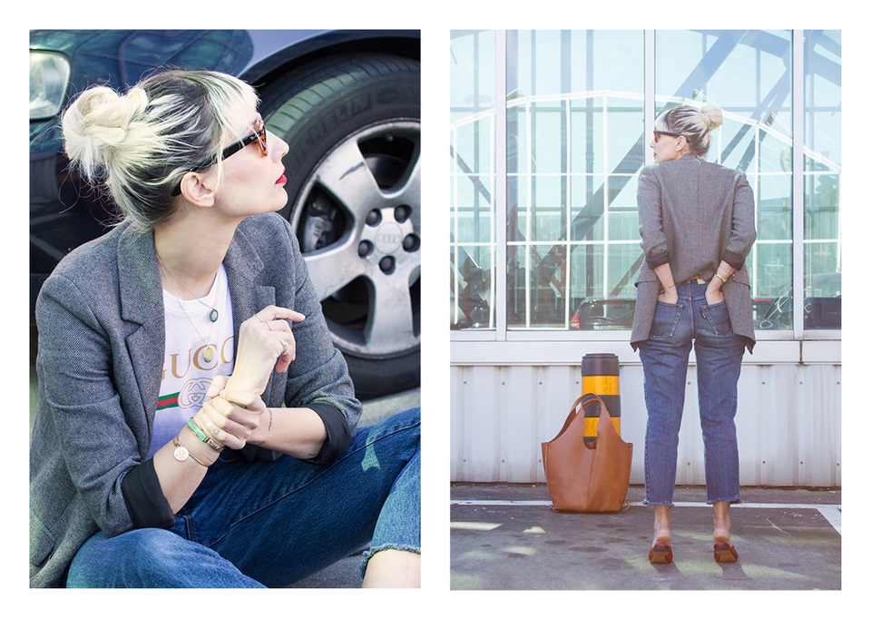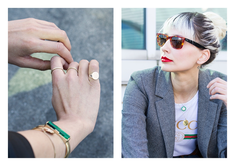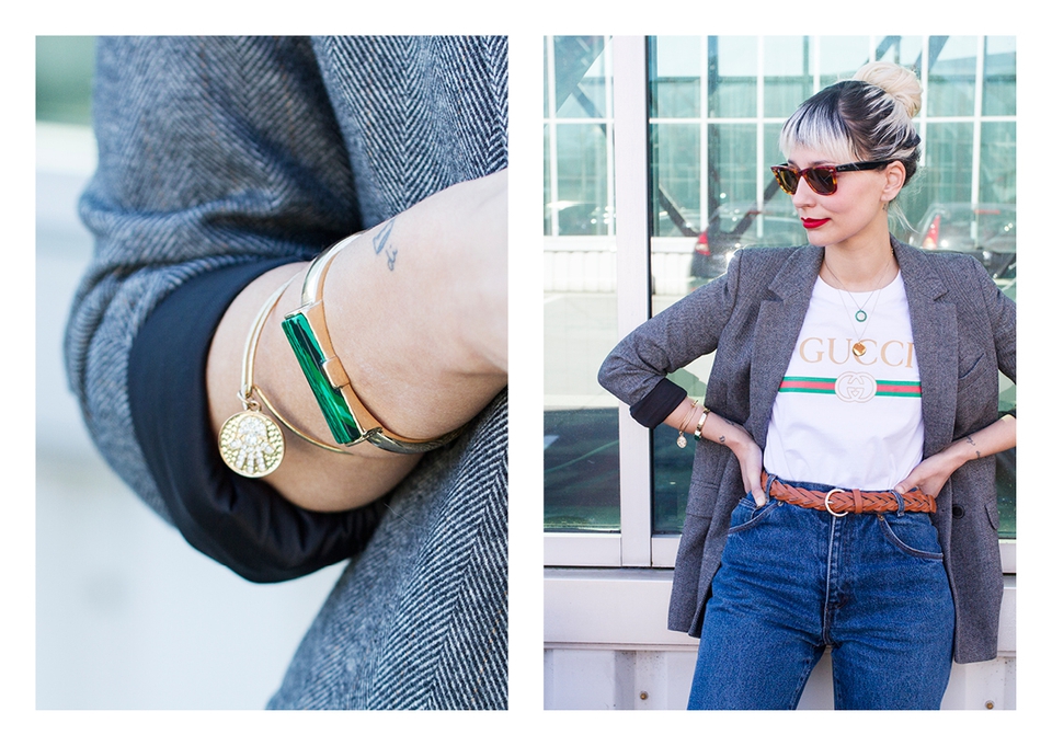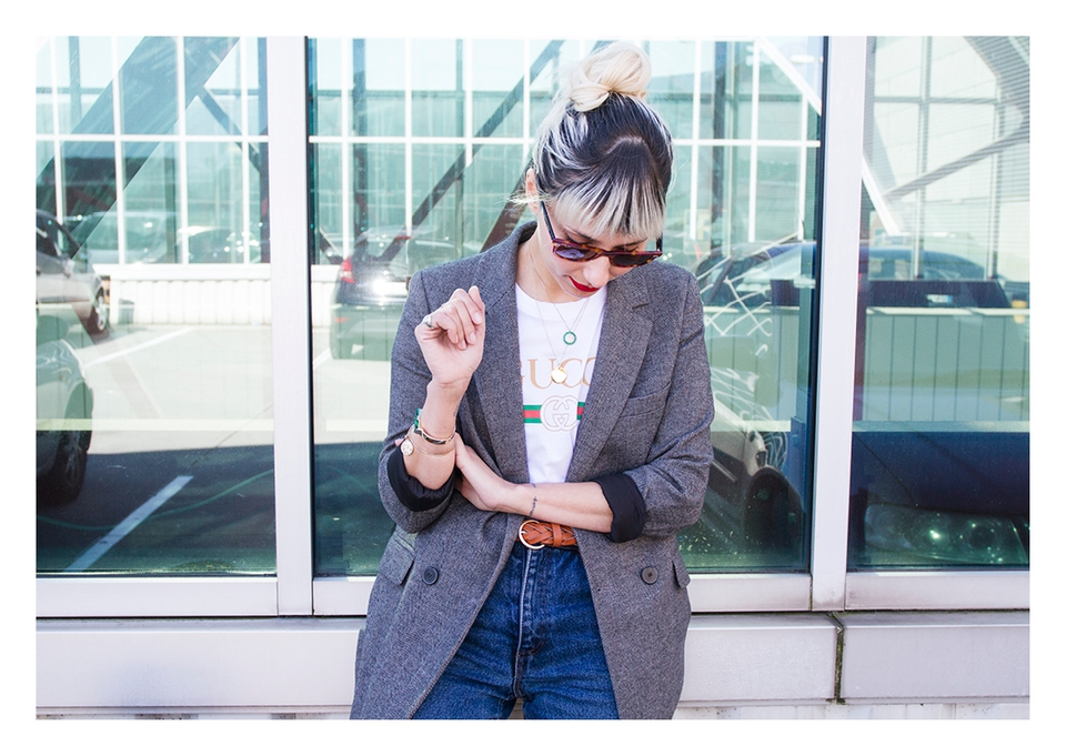 . Sunnies Ray Ban (Wayfarer) . Lipstick Sephora (Cream Lip Stain, Flame Red) . Blazer Zara . Necklaces somewhere in Cúria & Le Love . T-shirt Shoelaces . Rings Lia Gonçalves & N.Y. Jewellery . Bracelets&Bag Parfois . Belt Lefties . Jeans Vintage (Absolutribut) . Shoes Gucci .