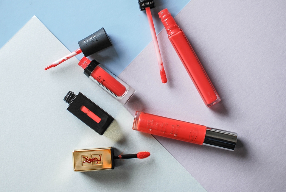 Peggy Sage So Shiny lip gloss na cor Shiny Romance Revlon Colorburst Papaya 020 (*) YSL Vernis à Lévres 8 Orange Chine Clarins Baume Solei 02