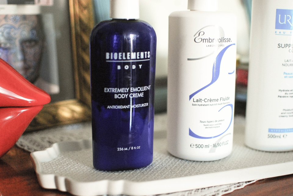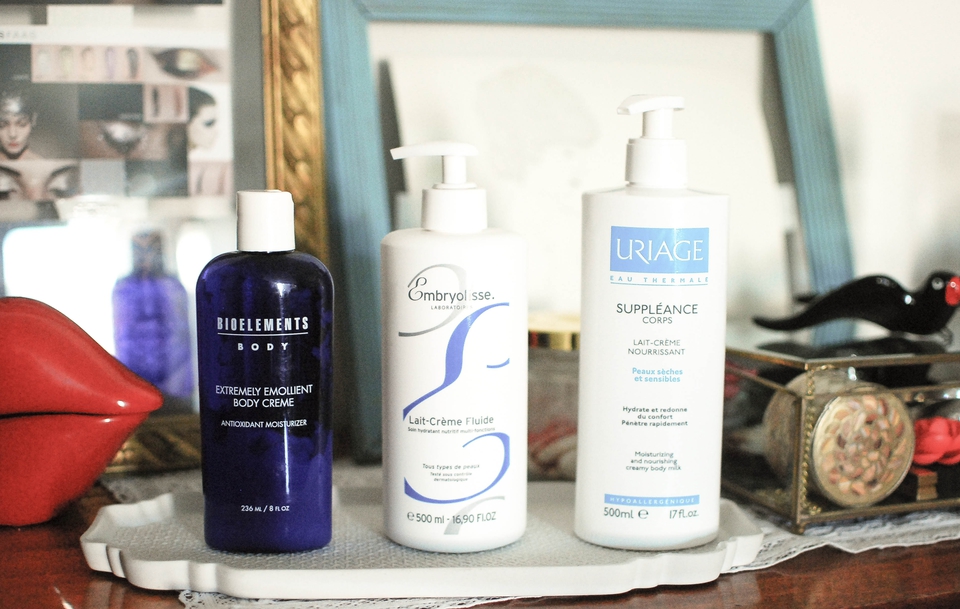 Por norma, opto por frascos de tamanho grandote, já que compensa em termos económicos e considero mais práticos na hora de usar, e dou preferência a texturas emolientes e ricas. Com isso em mente, andaram a uso (já há umas semanas) estes três cachopos: Bioelements - Extremely Emollient Body Cream, Embryolisse Lait Crème Fluide e o Uriage Supléance Lait Crème.