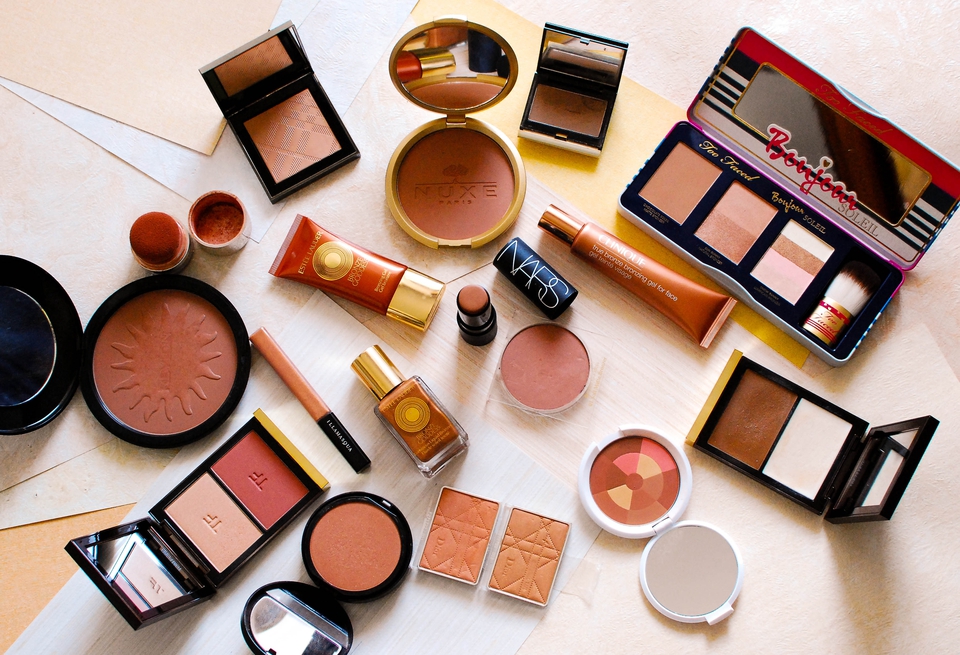 Olhando para muitos dos produtos que tenho e que se autodenominam como “bronzers” ou de contorno, o melhor é não ficar muito preso ao nome e irmos antes pela observação da cor da nossa pele e da cor do produto. Por exemplo, vejo imensa gente usar o Soleil de Tan da Chanel para fazer a modelação das bochechas, sendo que em muitas peles fica simplesmente ridículo nessa função, porque a cor é demasiado quente e laranja. Mas por outro lado, alguns pós bronzeadores da Too Faced, podem ser usados para o contorno, porque aproximam-se do tal castanho mais seco de que vos falei. Claro que isto depende não só do produto mas também do tom de pele onde é aplicado.