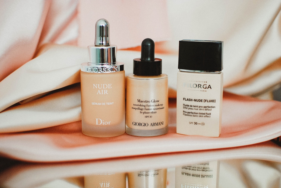 Para terminar, temos então as bases super fluídas como esta Nude Air Sérum de Teint da Dior que é uma água, basicamente, formulada com óleos que se evaporam depois de aplicada e que deixa a pele com aspecto tratado, rico e viçoso. Tem um dispensador em conta-gotas e há que ter cuidado para o líquido não resvalar pela mão fora. Não acumula nos poros nem nas linhas, e aplica-se de forma muito fácil. No entanto, apesar de ser a cor 20 (a minha nas escala de cores da Dior, que me fez comprar sem testar) tem uma tonalidade alaranjada que me desagrada e que me levou a recambiá-la para o meu kit na esperança de lhe dar alguma serventia. Outra base muito semelhante, é a Maestro Glow da Armani que conta igualmente com uma infusão de óleos nutritivos e que tem como resultado uma pele luminosa, repulpada e muito natural. Apesar de leve, tem uma cobertura competente, e é ideal para peles maduras e secas, já que não vinca nem acumula. No entanto, e mais uma vez por burrice minha comprei a 4, que é a minha cor na base Luminous Silk da mesma marca, e lixei-me, porque também é muito alaranjada para mim.