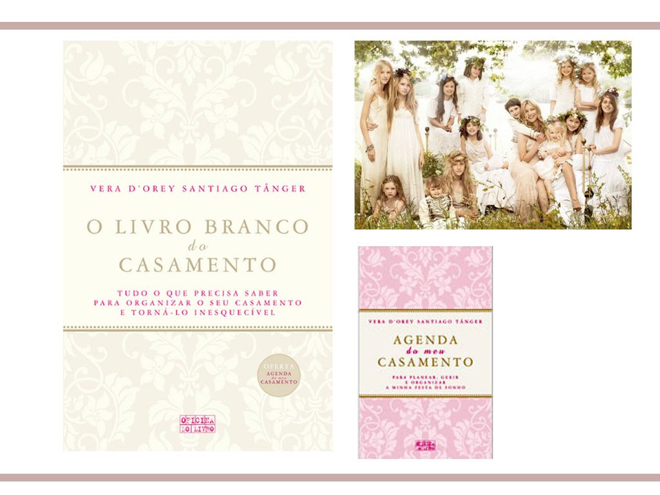 Foi numa dessas reuniões que uma noiva, muitíssimo organizada, nos deu a conhecer "O Livro Branco do Casamento", da Vera d'Orey e Santiago Tânger, dedicado não só à noiva, mas a todos aqueles que querem participar e colaborar na organização do grande evento. Entre outros assuntos, fala sobre a questão do orçamento, o estilo do vestido de noiva, a escolha da maquilhadora, do fotógrafo...Enfim, decisons, decisons...