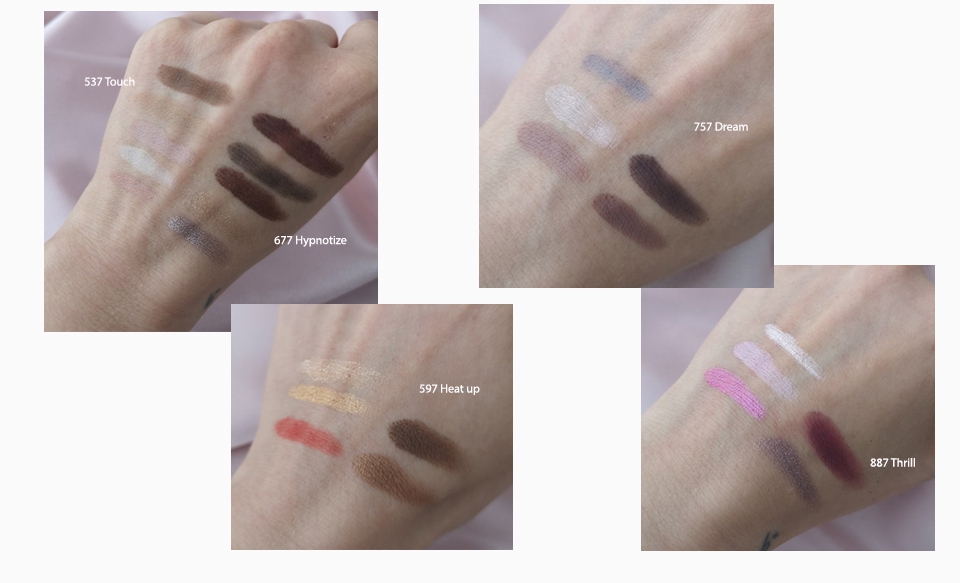 677 HYPNOTIZE . é A PALETA mais bonita que comprei nos últimos tempos de tal maneira que estou a ponderar comprar outra para stock. Que coisa tão bem esgalhado. Temos duas cores em cima -uma mais prata rosada e outra dourada- que tornam o resto do conjunto bastante versátil. Depois, ao centro, temos um cor de telha avermelhado com acabamento acetinado. Do lado direito, umas das minhas cores preferidas de todo o sempre, um beringela mais quente e mate, que fica maravilhoso em todos as cores de olhos. E, do lado esquerdo, em baixo, um castanho com partículas douradas que é boa para dar sublimar, de forma dramática, os olhos.. O prata e dourado não são cores compactas, ou seja, funcionam melhor para dar acabamento cintilante à maquilhagem e que aplico com o dedo, pressionando na pálpebra, em cima de outra cor qualquer. Também funcionam muito bem misturadas, quando queremos um acabamento indefinido.