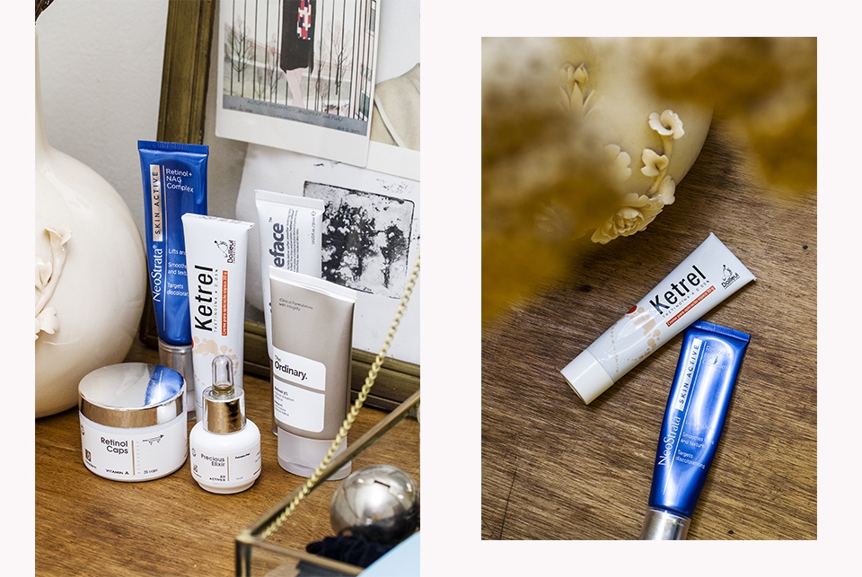 Ora vamos a um dos produtos com retinol mais conhecido mas que apenas se compra com receita médica. O Ketrel é um creme à base de Tretinoína (ou Ácido retinóico), com concentração a 0.05% e é um dos ingredientes mais usados no tratamento da acne, do envelhecimento e das manchas escuras provocadas pelo sol. A sua mais-valia prende-se com o facto de actuar como um poderoso renovador da pele, antioxidante e que tem a capacidade de aumentar a produção de colagénio. Como no meu caso a pele seria demasiado sensível para aguentar este produto puro, comecei por usar manipulado ou seja, diluído, como expliquei neste post. Posteriormente, aumentei para o produto directamente do tubo e correu bem, desde que espace a sua aplicação e evite as maçãs do rosto, por causa da rosácea. Faz a pele descamar com alguma intensidade mas consigo controlar os efeitos colaterais com algum reforço da hidratação e produtos calmantes.