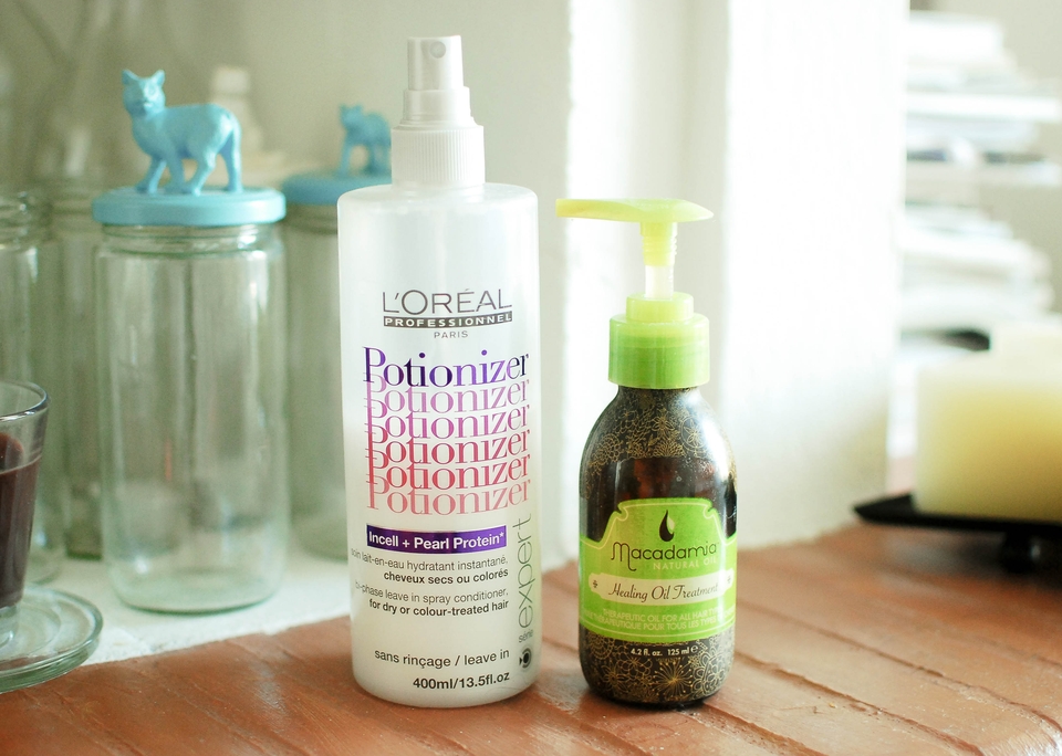 Depois de enxugar o cabelo com a toalha e para facilitar a escovagem, recorro a este Potionizer da L'Oréal que é um leave-in bifásico, versão cabelo seco e com cor, que hidrata e desembaraça o cabelo instantaneamente. Geralmente uso na melena molhada mas em dias de cabelo mais agreste, uso mesmo em seco e antes da escovagem. Diz a marca, que a fase aquosa repara, disciplina e nutre e a fase em leite dá luminosidade e protecção ao cabelo. Diz ainda que facilita a secagem (apesar de a esse nível não notar grande diferença), dá suavidade, fecha a cutícula e refresca.
