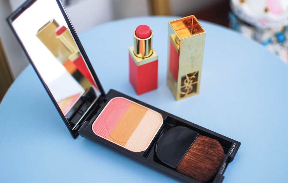 Shiseido Face Color Enhancing Trio RD1 Apple + YSL Rouge Pure Shine Sheer Lipstick 7JBA 28