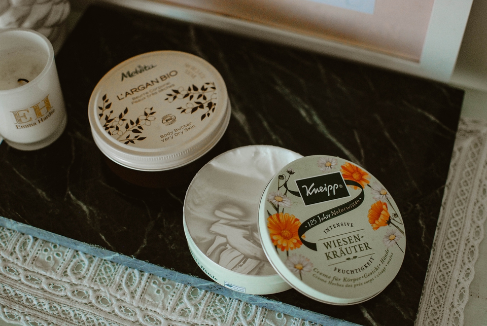 Depois, duas latinhas muito fofas, tipo as da nivea, que albergam um creme menos espesso, é verdade, mas ainda assim, competente. Falamos da L'Argan Bio Body Butter da Melvita a qual, na verdade é uma manteiga de corpo mas que, pelo tamanho, a reservei apenas para mãos e pés. Tem glicerina, óleo de semente de girassol e manteiga de karité, e achei-o bem janota para usar à noite. A outra é da Kneip, uma marca que vale a pena conhecer se gostam de elevar o vosso banho a um nível mais luxuoso, já que tem imensas opções de sais, geles e espumas de banho. Divinas. Deste creme em particular, já não o encontro online para deixar aqui o link.