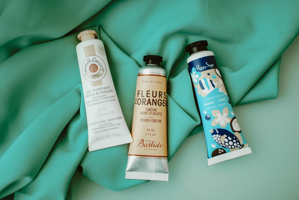 Começando pelos tamanhos petit, muitos jeitosos para trazer pela mala e reforçar a hidratação das mãos a qualquer hora e, sobretudo depois de as lavar (ainda que na paranóia de as lavar de 10 em 10 minutos, de pouco ou nada servem) tenho este Gel purifiant mains&ongles da Rogger&Gallet no aroma Bois d'Orange que só me apercebi que não era um creme quando o comecei a usar. Trata-se na verdade, de um gel desinfectante muito cheiroso e fofinho ao qual, nesta fase, não me fio para higienizar as mãos porque não sei qual a concentração do álcool que tem mas, a ele tornarei a seu tempo. Na mesma linha olfactiva, temos o Fleurs d'Oranger da Bastide com manteiga de karité que sacia as mãos secas, sem ser demasiado pesado. E ainda o Hands Cream Monoï-Tiaré da Peggy Sage que ainda não foi chamado a prestar provas mas gosto, por norma, dos produtos de mãos desta marca. É uma pena a expocosmética ter sido adiada, já que lá é o único sitio onde compro anualmente uns petits-riens da marca, mas em Outubro, lá estaremos!