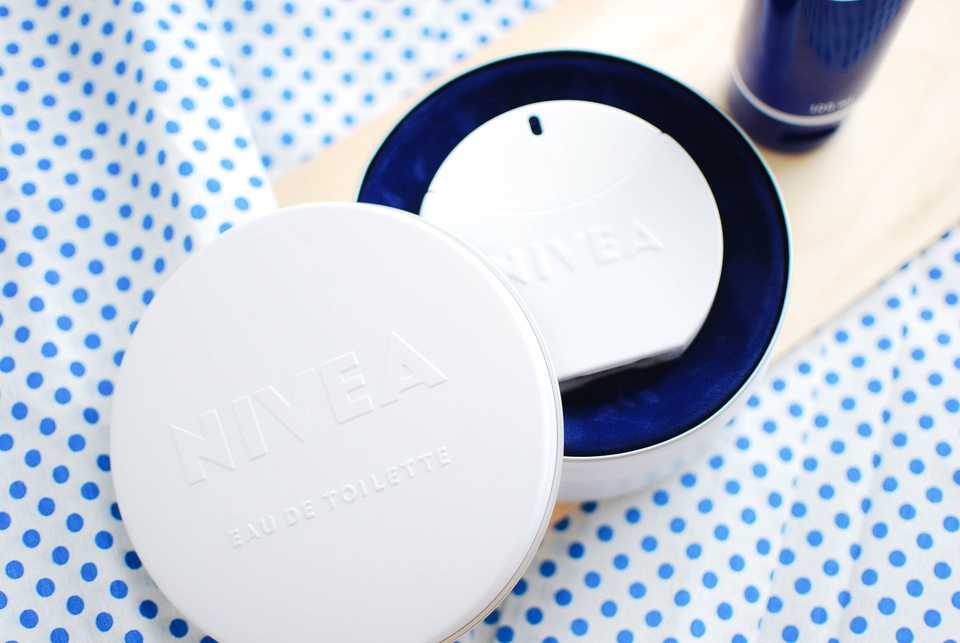 E cá está ele, o Eau de Toilette Nivea que me surpreendeu pela embalagem muito elegante e especial, abrigado numa lata semelhante ao produto original, mas lacada em branco, dentro da qual, embutido numa base aveludada azul, temos o frasquinho com 30ml de Nivea em estado liquido. Um miminho, não acham? Como todas as águas perfumadas, não dura muito mas é o suficiente para andar sempre de nariz colado no pulso!